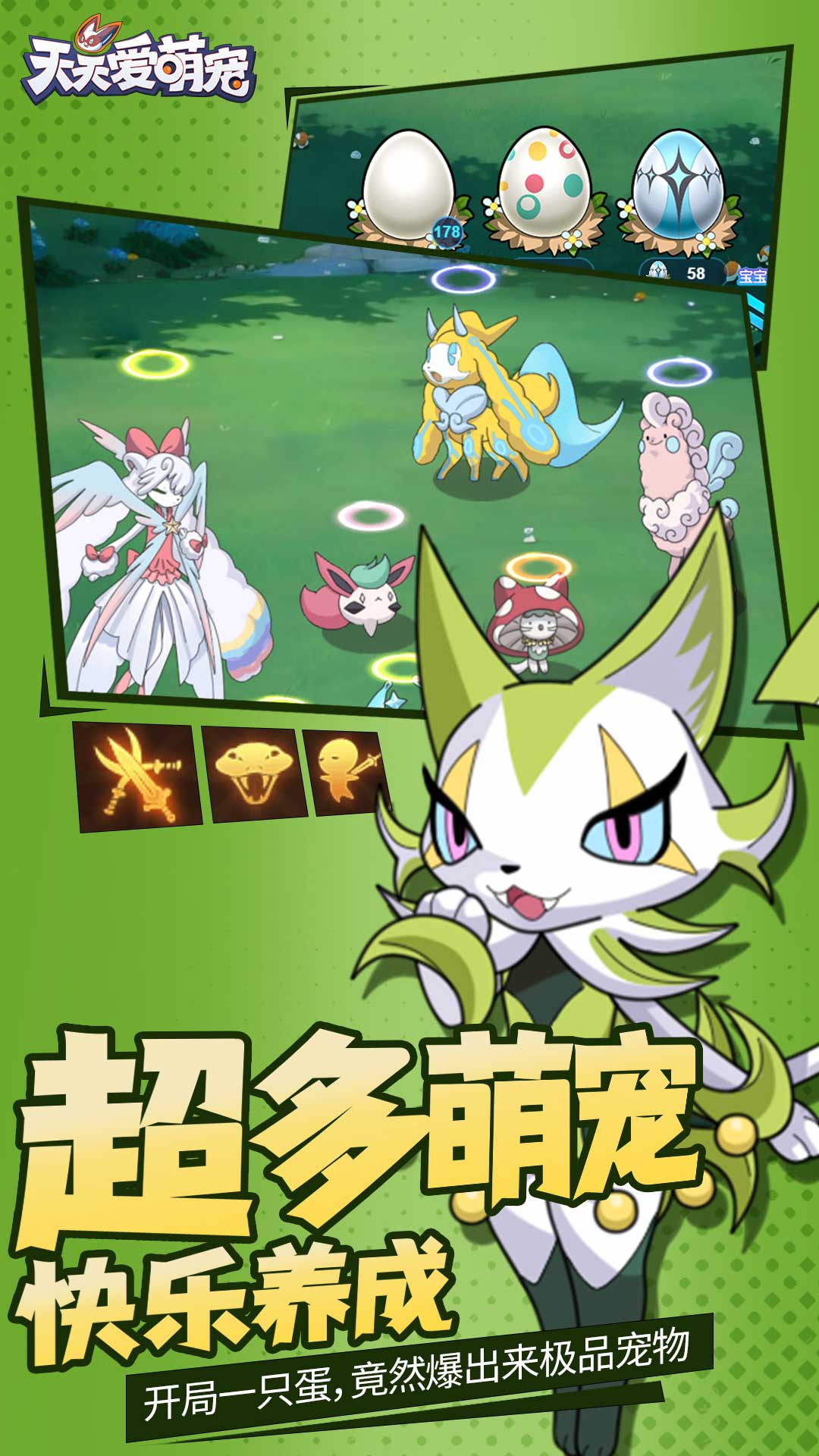 《天天爱萌宠》是一款休闲卡通萌宠养成游戏,集合了经典梦幻等回合制核心战斗玩法,经典宝宝养成,洗练等,再配合简单休闲的开蛋升级养成体验,游戏非常适合轻松休闲玩家,以及回合制养成玩家。核心玩法涵盖了宠物养成,宠物技能洗练,宠物抽取,回合制多人战斗等核心玩法,同时也具备竞技场、航海战役等多人交互竞争玩法,让大家可以带上自己养成的宠物进行同台竞技!游戏关卡主要为野外战斗,在《天天爱萌宠》魔法世界中,不同地域的环境下,生存着各种不同种类的萌宠宝贝,玩家需要逐步探索不断解锁全新的地域以及魔法宠物!