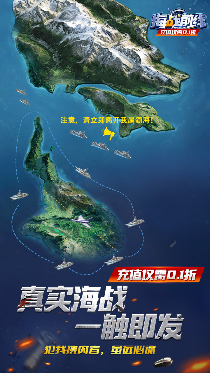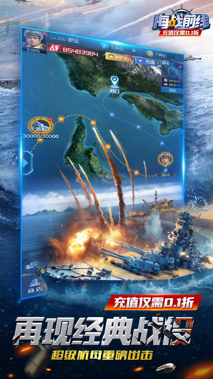 《海战前线》是一款以未来海域军事战争为世界观的放置卡牌策略游戏。游戏深度还原超多种类航母、驱逐舰、潜艇、战列舰等经典战舰,其搭载超多种类舰载机、导弹、装备、舰炮等经典军武,为万千军迷玩家量身打造超多组队闯关、PVP、跨服等玩法,玩家将在这里组建水域最强舰队,共同推演一场场酣畅淋漓的经典海战。史诗再现,超燃战斗,只为等待真正的统帅!