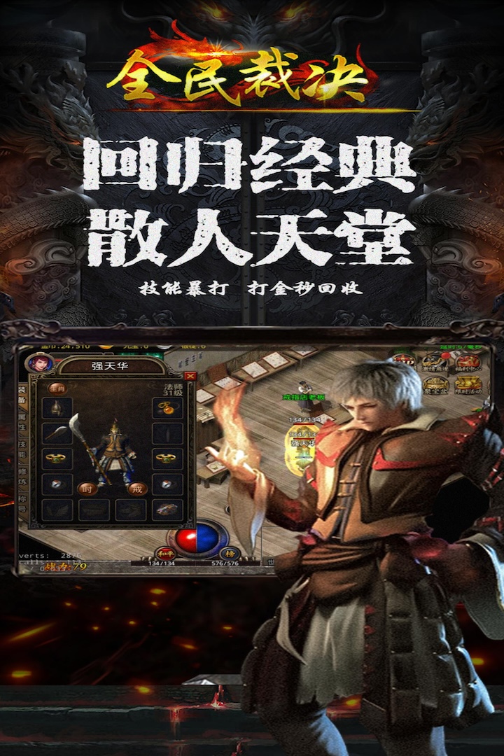 复古还原正版传奇,回首青春记忆,男儿至死是少年,回归经典散人天堂,打金秒回收,装备回收自由交易,麻痹屠龙裁决噬魂,爆率超高!千人攻城真实PK,攻皇城当城主血战沙巴克!致敬经典,不忘初心!