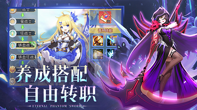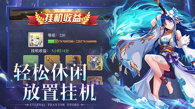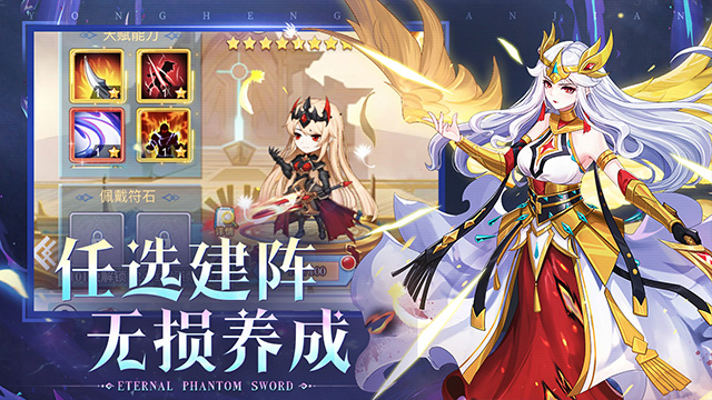 《永恒幻剑》是一款二次元卡牌回合制放置游戏。全新设计的精美英雄模型,带您进入一个崭新的异世界;休闲放置的玩法,生动精彩的野外探索,让您在轻松愉快之余,仿佛置身真实的世界之中。游戏中您可以获得高星,给英雄升级、转职、穿戴装备、上阵/升级侍从,这些可以有效提高战斗力,而策略放置英雄的位置更可大幅增加胜率,助您一路闯关推图!