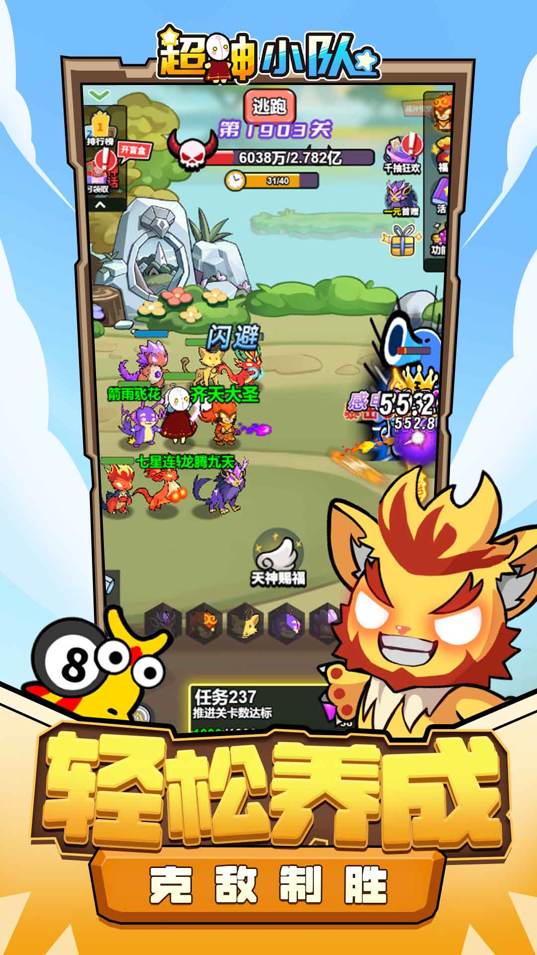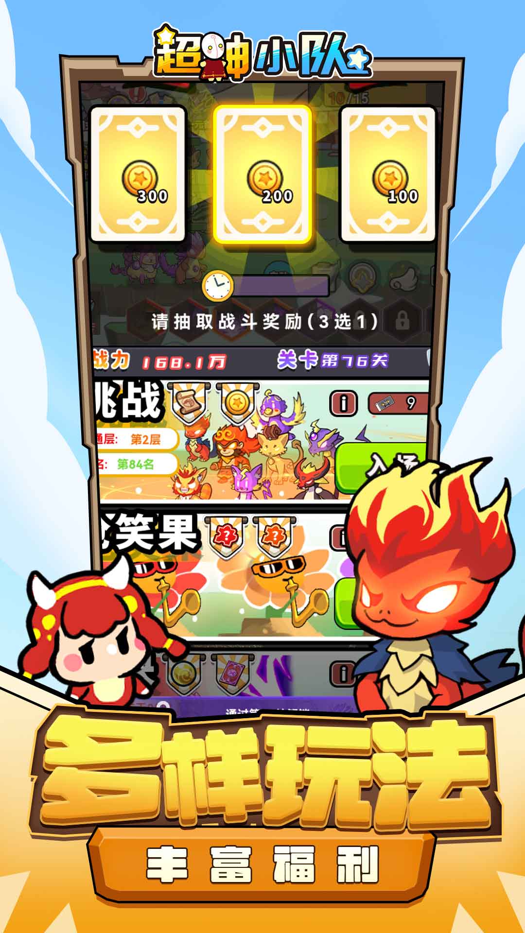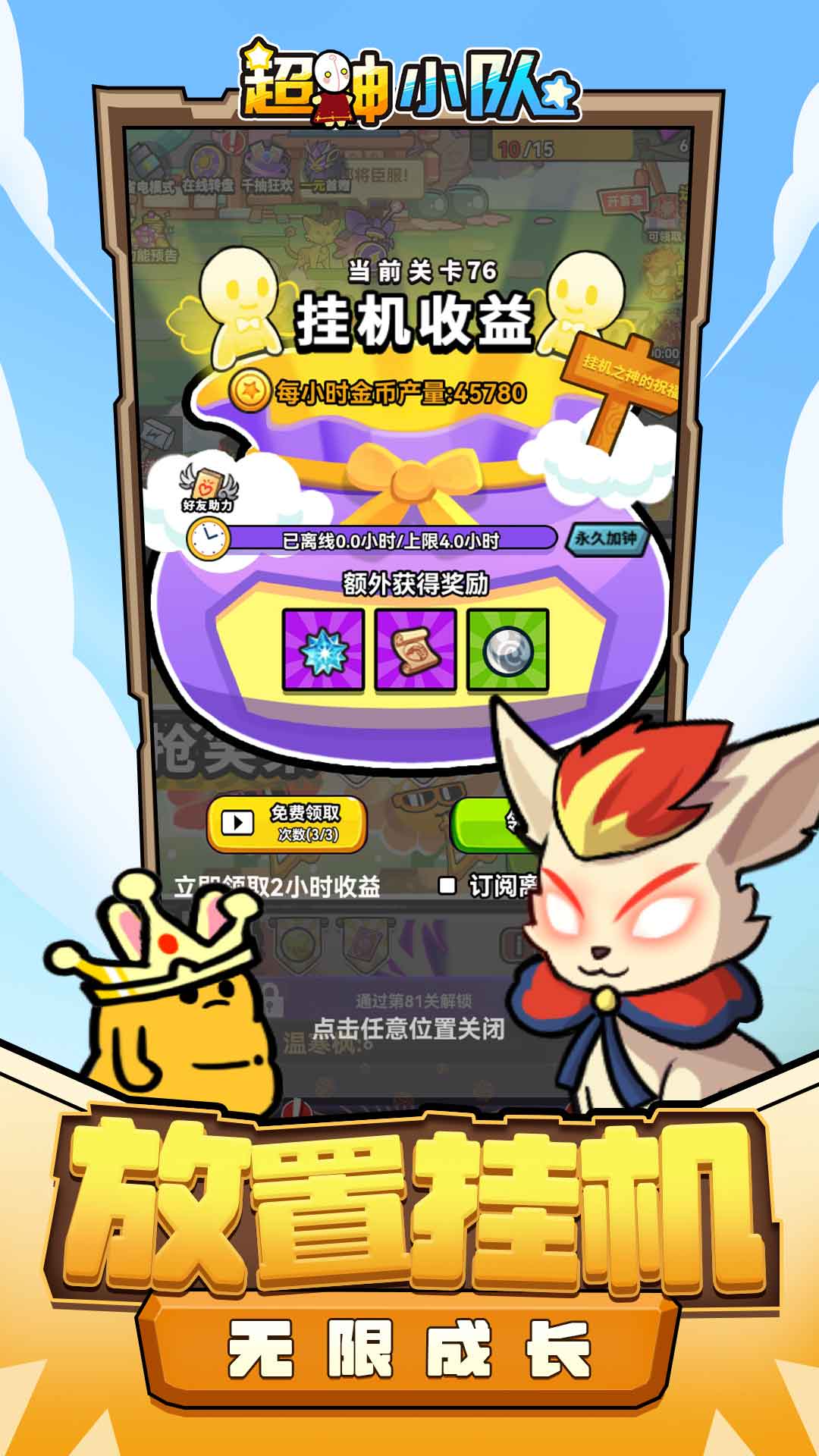《超神小队》是一款挂机类小游戏,佛系玩法,轻松游戏,海量福利,随玩随停护肝又养肝,惊喜与奖励等你来探索!